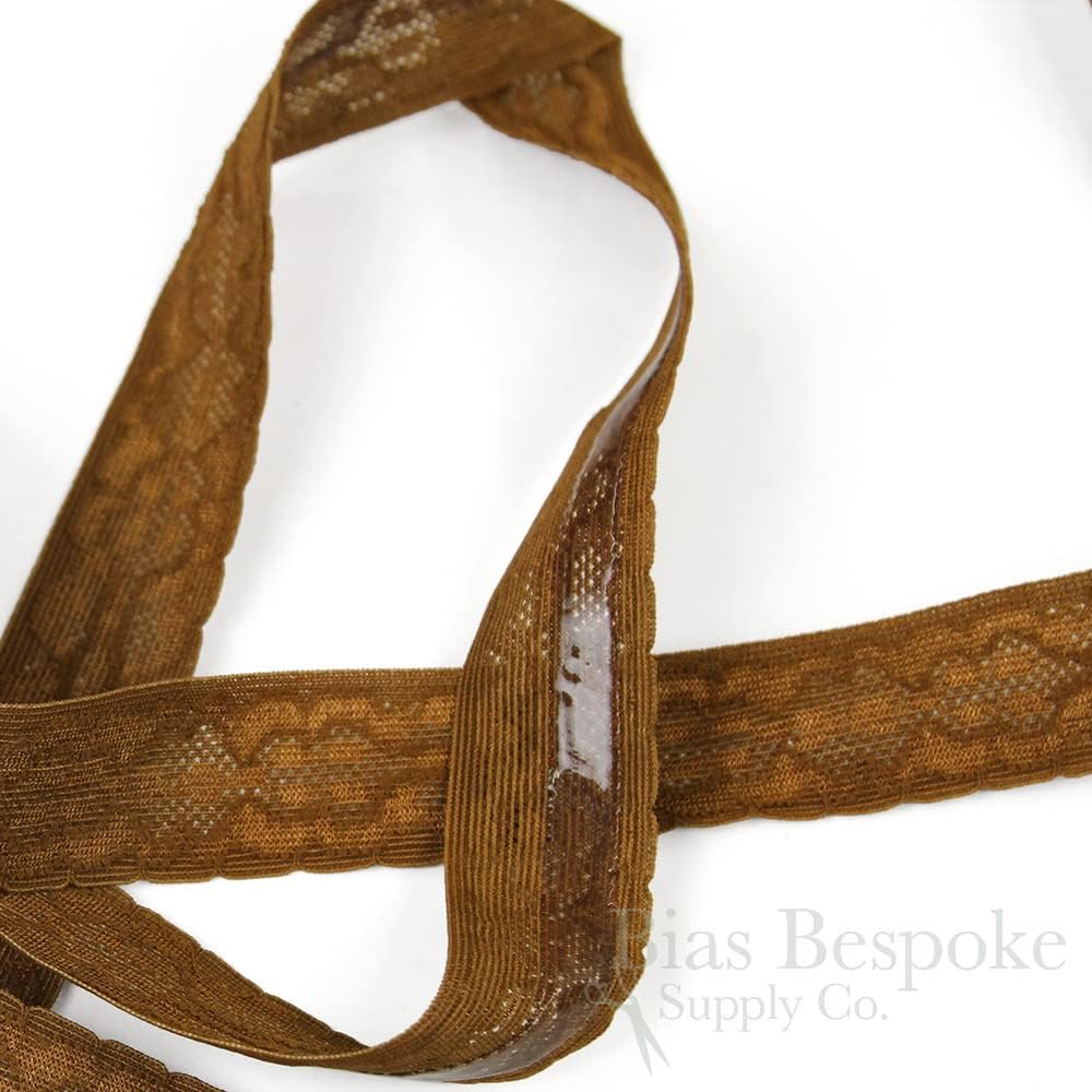Floral stretch lace trim backed with a strip of clear silicone to provide comfortable grip. 1 1/8" (38-39mm) wide. The colors match our other lingerie elastics. Made and dyed in Italy.