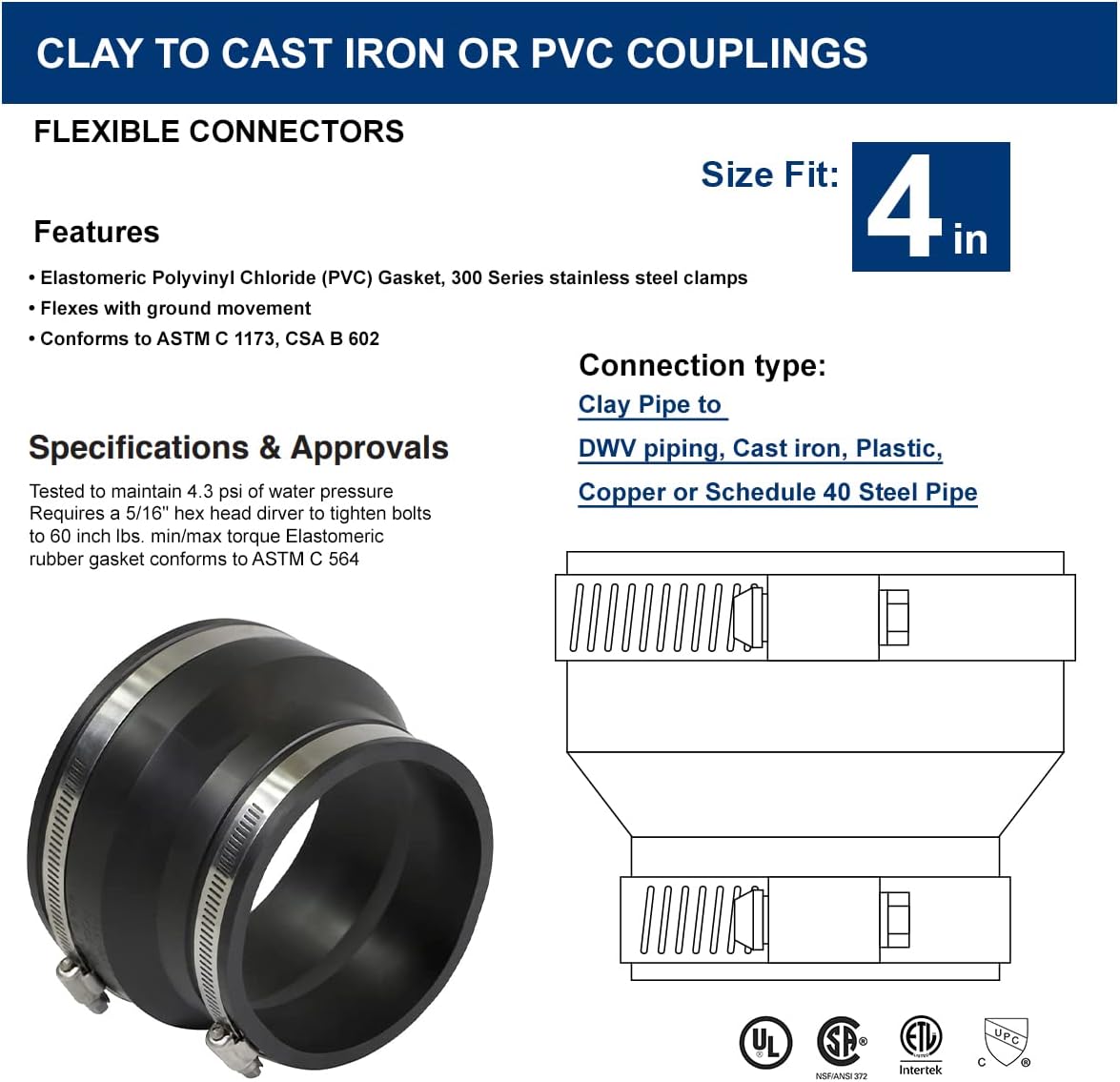 Flexible Coupling Compatible with cast iron, plastic, copper, lead, and steel piping Flexible Connectors are Leak-Proof, Rot-Proof and Sealed Against Infiltration and Exfiltration, May be used for non-pressure drain, waste, and vent (DWV) piping systems and sewer systems indoors and outdoors Conforms to ASTM C1173, CSA B602, Certified and UPC Approved, Rated for underground use Each Rubber Fitting is marked with part number, size, and certifications