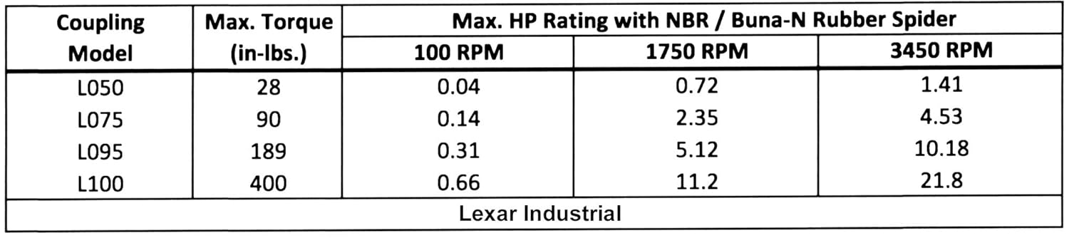 3-piece L075 series coupling set includes two coupling halves and an NBR rubber insert. 7/8" bore with 3/16" keyway and set screw on one coupling half. 1" bore with 1/4" keyway and set screw on the matching coupling half. Interchangeable with Lovejoy, Martin, Browning, TB Woods, and other L-jaw couplers.