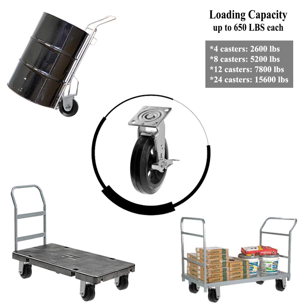 Wheel Width 2" Wheel Diameter 8" / Plate size: Top plate 4"x4-1/2", mounting over heights 9-1/2" 2600 lbs total capacity(4 x weight capacity than others on the market) / pack of 4 / Material: Rubber Mold on Steel Includes: 2 Swivel with Brakes & 2 Rigid(Swivel can be rotated 360 degree) Roller bearing with hardened raceway for extra strength Warranty: 90-Days hassle free return policy for all products purchased 100% satisfied guarantee