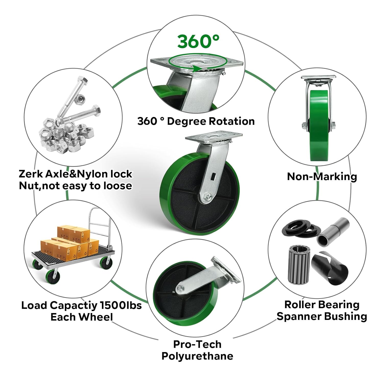 【Heavy-Duty Casters】The heavy duty casters are made of high-quality polyurethane molds, bright galvanized steel wheels and yokes. The caster wheels have strong abrasion resistance, are not easy to rust, and have strong shock absorption and buffering performance, which increases the service life. 【Caster Size】: Industrial caster diameter: 8 inches, width: 2 inches. Plate size: Top plate 4"x4-1/2", mounting over heights 9-1/2", One caster wheel Load capacity is 1500lb, one set of 4 load Capacity will be 6000LB. 【Caster Feature】 The casters are wear resistance and durability, and their sturdy construction are designed for Industrial Equipment. The Caster Wheels are specially engineered to withstand harsh chemical environments and are resistant to greases, blood, oils, brine, solvents, and water including wash down applications. 【Widely Application】The 8 inch caster wheels can be used indoor and outdoor. Steel casters have a wide range of uses, such as pallet trucks, inventory carts, trolleys, platform carts, furniture,workbenches and many other uses. 【Brand Warranty】2 Years Warranty, Free Replacement -HANDSAMMU’S industrial casters which is a highly known brand of caster wheel and known for its quality.