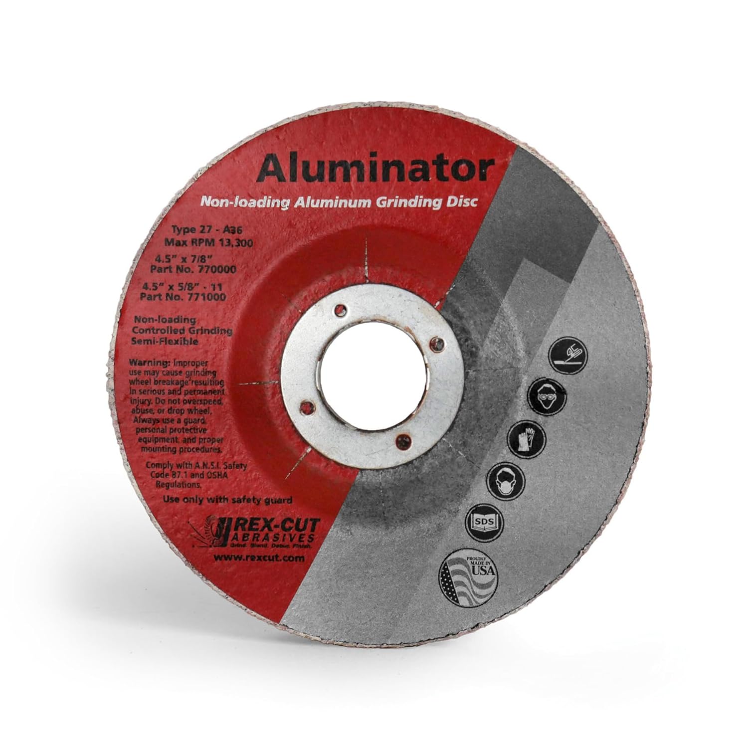 Our Rex-Cut Aluminum Grinding Kit contains 1 Aluminator Grinding Wheel, 1 Max Flex Blending Wheel, and 1 Aluminator Cut-Off Wheel. This kit contains everything you need to grind, blend, and cut aluminum.