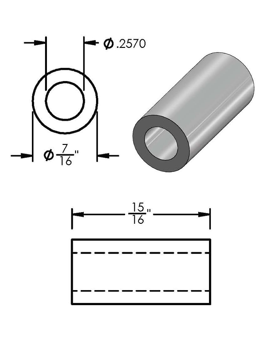 Outside diameter: 7/16"/11.11mm Inside diameter: 1/4"/6.52mm (fits 1/4" or M6 bolts) Length: Varies-Choose Length Shape: Round Material Type: T-6061 Aluminum with tumbled aluminum finish