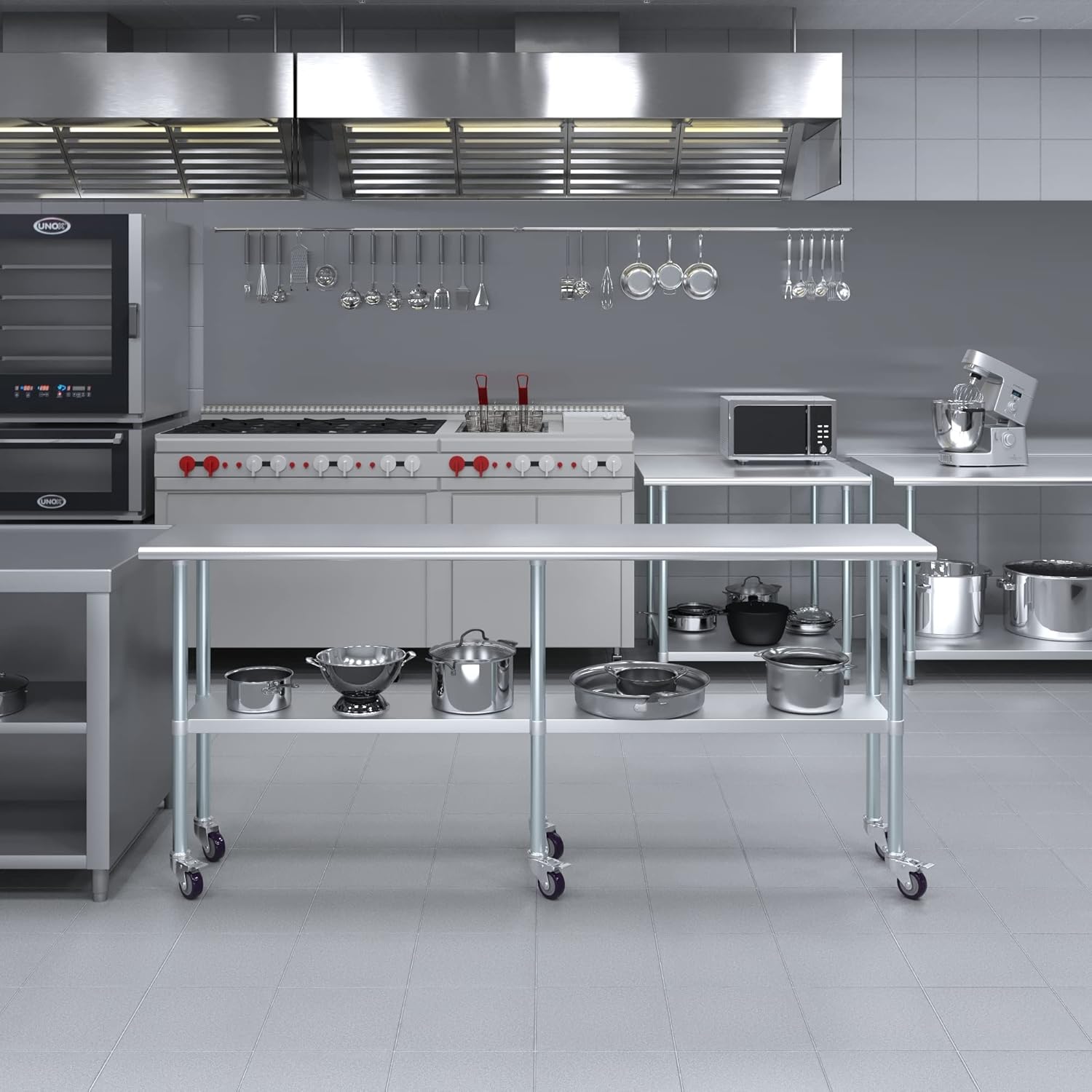This heavy-duty industrial quality multi-purpose stainless steel utility table with casters is a great fit for a variety of commercial and residential applications such as commercial kitchens, garages, labs, laundry room, etc The tabletop is made with 18 gauge 430 stainless steel The bottom shelf and the legs are made with galvanized steel. Adjustable bullet feet allow to improve stability on uneven floors and prevent the floor from being scratched. Includes a set of 6 casters for easy mobility. Three of which are locking NSF certified to meet the strictest standards for public health protection. The industrial-quality manufacturing process meets the highest regulatory requirements for construction, safety, and durability Made with corrosion resistant 430 Stainless Steel table top. Assemble and install with no effort. No additional tool or kit needed. Assembly instructions and everything you need is included. This mobile stainless work table has a weight capacity of 570 lbs, evenly distributed. The bottom shelf has a capacity of 330 lbs, evenly distributed