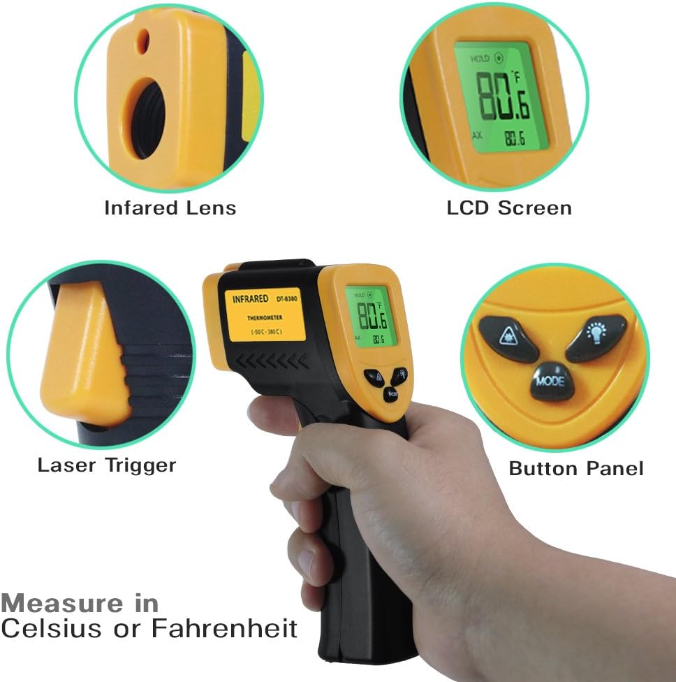 Built-in laser enables more accurate reading Suitable for a variety of applications both indoor and outdoor. Auto shut-off, low battery indicator, data hold, and backlight display. Measures in Fahrenheit and Celsius from -58℃ – 716℃ (-50℉ – 380℉) Emissivity adjustable from 0.1 – 0.99