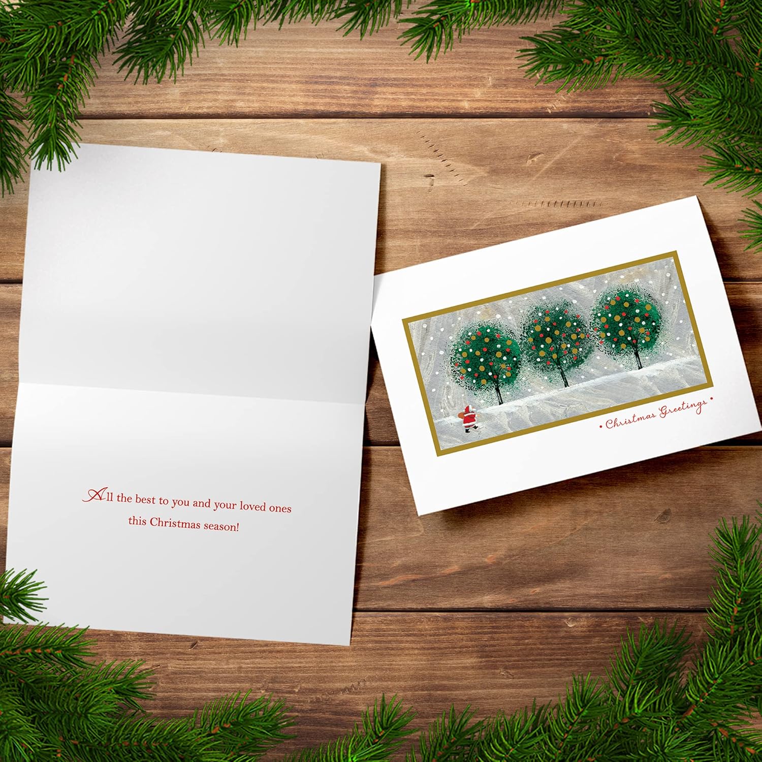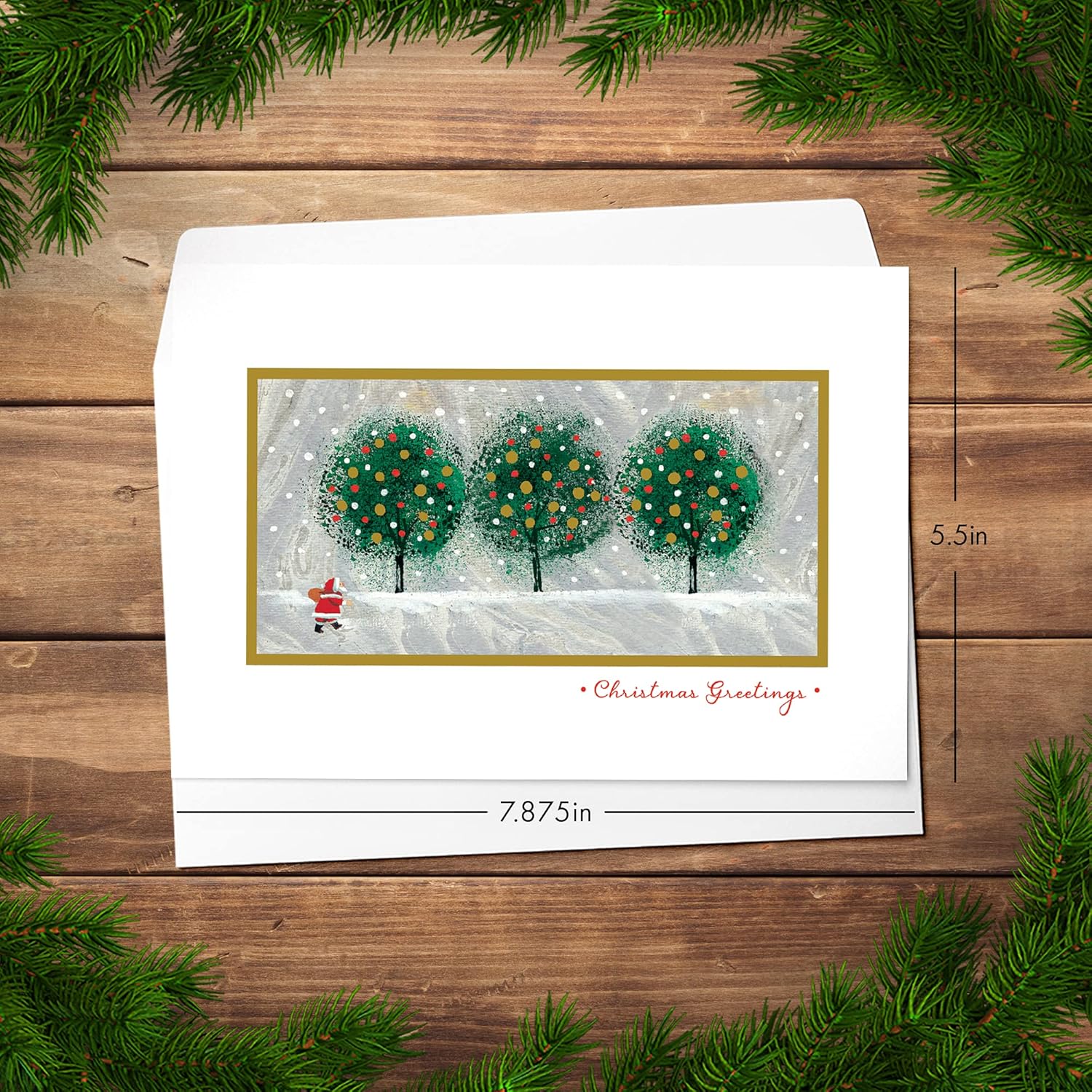 FUN AND FESTIVE – This holiday season, share the time-honored traditions of warmth and elegance with those you hold dear with this box of 18 exclusive holiday cards from Designer Greetings. As part of our Sapphire Collection, this festive foil-embossed card features a lovely illustrative scene with Santa Claus and a trio of decorated trees. FRONT/INSIDE MESSAGES – Front : “Christmas Greetings”. Inside: “All the best to you and your loved ones this Christmas season!” PREMIUM QUALITY – Each box contains 18 DG Sapphire Collection Christmas cards and 18 white envelopes. Each card is printed on the finest quality cardstock and is expertly crafted with foil embossing treatments for an extra special finishing touch! GIVE THE BEST FOR LESS – By buying in bulk, you will be able to connect in a memorable way with all of your loved ones who celebrate and honor their religious traditions during Christmas. DIMENSIONS – Each card measures 7.875” x 5.5” and comes packaged in a sturdy cardboard box with a clear acetate lid and metallic elastic cord for safe and stylish storing.