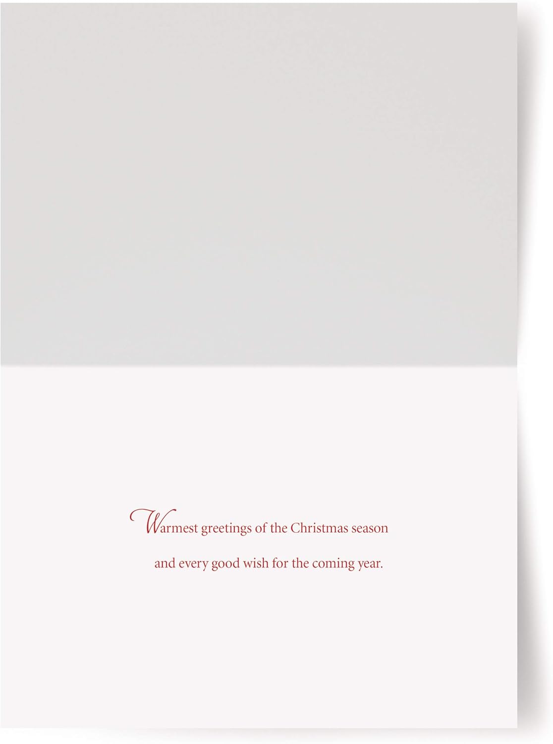Card features a reproduced painted image of a small wooden boat loaded with Christmas tree, lights and presents Inside verse reads “Warmest greetings of the Christmas season and every good wish for the coming year.” 18 cards and envelopes; card size: 5.5 inches by 8 inches Each card is embellished with foil and embossed treatments Nautical/Coastal design characteristic of the 50-year heritage of Red Farm Studio Fine Nautical/Coastal Designs Verse reads “Warmest greetings of the Christmas season and every good wish for the coming year.” Embellished with foil and embossed treatments. 18 Cards and envelopes Boat loaded with Christmas tree, lights and presents.