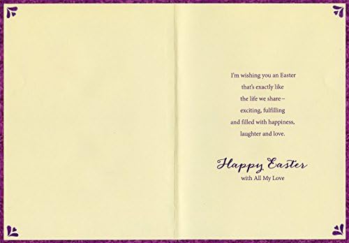 The interior of this Designer Greetings easter card design reads: I’m wishing you an Easter that’s exactly like the life we share - exciting, fulfilling and filled with happiness, laughter and love. Happy Easter with All My Love. The card measures 5.75x8 inches and is printed on heavy cardstock. Includes 1 card and 1 envelope. The card has the following special features: embossed, glitter, tipped insert.