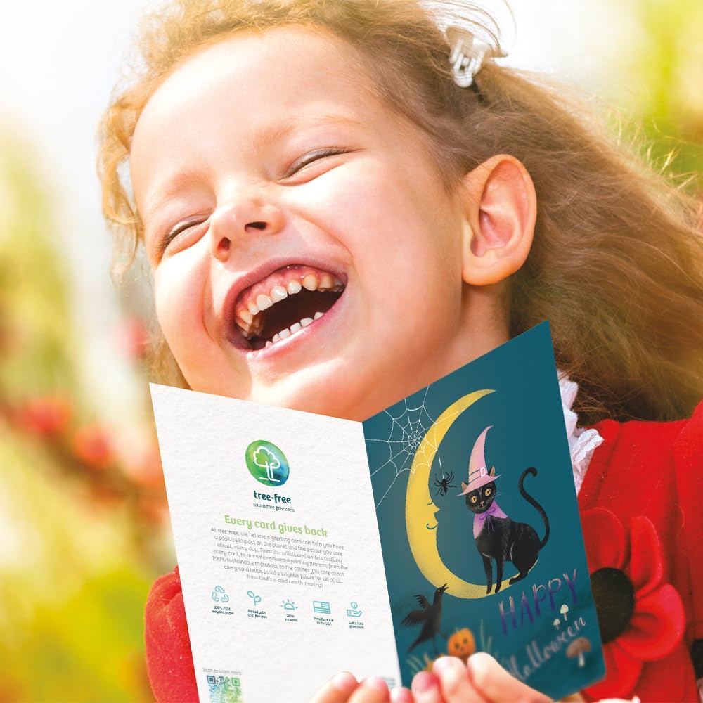 INSIDE GREETING: [Blank] | COVER GREETING: “happy halloween”. These frighteningly fantastic designs of Halloween cards are the perfect way to add a ghoulishly good touch to your celebration. SUSTAINABLY MADE IN THE USA - Tree-Free’s premier, budget-friendly greeting cards and envelopes are made in Keene, NH from 100% post-consumer recycled paper. Extra- thick card stock provides a sturdy and durable high-quality feel. These cards are printed using 20% less waste than conventional printing, with solar power and using VOC-free inks. WHIMSICAL DESIGNS - Spread joy, love, and kindness with a Tree-Free greeting card. The most meaningful gestures come out of the blue. Sending a greeting card “just because” brings a smile, joy, warmth, and a touch of surprise to someone’s day for any occasion. PREMIUM QUALITY - These cards are no exception to Tree Free’s commitment to providing high-quality products. Each card is handcrafted with care, using premium cardstock and environmentally sustainable materials. The end product is a long-lasting, beautiful card that stands out and creates an everlasting memory. PERSONAL MESSAGES FROM THE HEART - In this digital age of emails and text messaging, the personal touch of handwritten notecards goes a long way toward brightening someone’s day. Everyone loves to get a personal and meaningful physical greeting card.