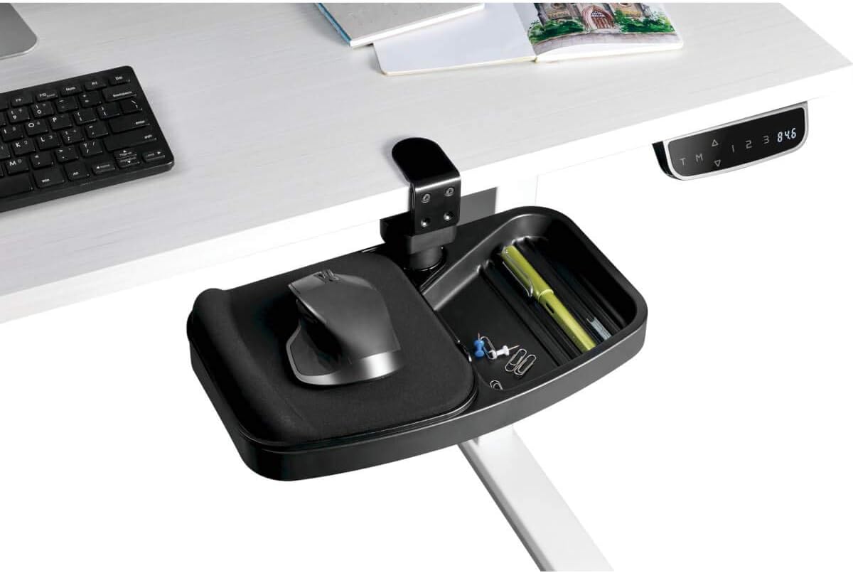 BUILT IN MOUSEPAD: A generously sized mouse pad with a smooth-glide surface and soft wrist rest fits most standard mice. The mouse pad swivels to either side to accommodate both right- and left-hand users. REDUCE CLUTTER: Place small items beneath the desktop and keep your desk clutter-free! This desk organizer tray gives you more room to work, and all of your stuff is organized and just an arm’s reach away! STASH AND SWIVEL: Compact desk drawer organizer stores supplies under your desk, and rotates 360 degrees to be out of the way when needed. It clamps to a desk at a comfortable height and angle for ergonomic arm/hand placement. QUICK & EASY INSTALLATION: The drawer securely clamps to the front edge of your standing desk or any flat surface up to 2.2 in. thick with no tools or hardware needed!