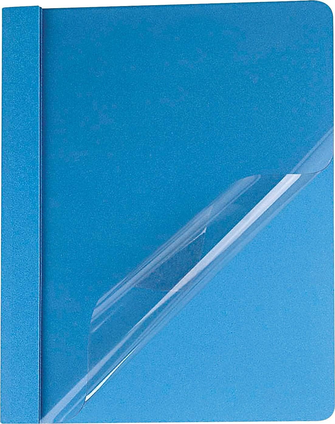 Traditional clear front report cover offers a full view of your title page. Three prong fasteners hold letter size punched sheets. Leatherette embossed paper back cover. Front Cover Color(s): Clear; Back Cover Color(s): Light Blue; Sheet Size: 8 1/2 x 11; Capacity Range [Max]: 1/2".