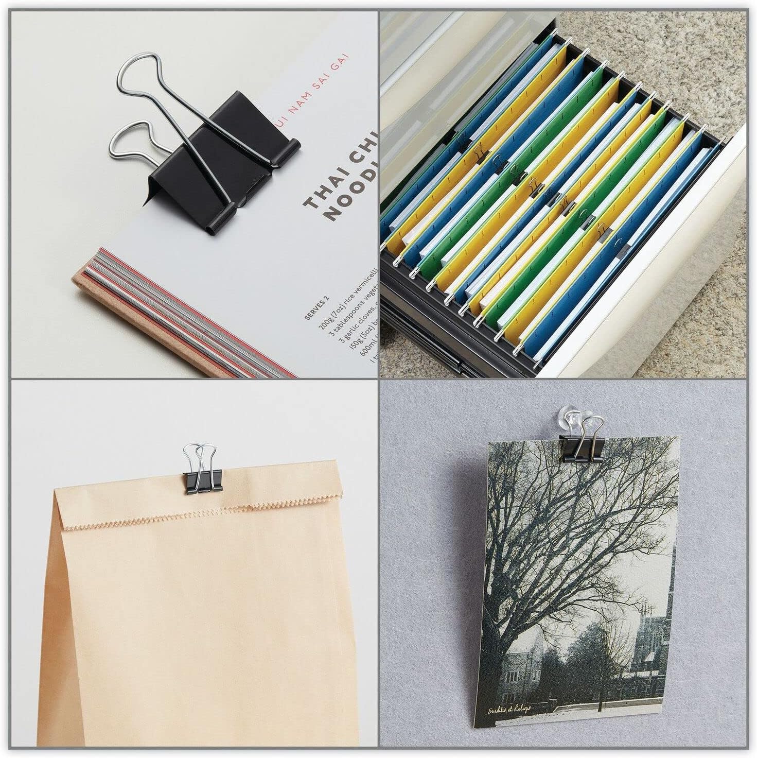 Ultra-efficient binder clips feature handles that can be hung, folded flat against clipped material, or removed for permanent binding. Efficient triangular design provides optimum strength and compression.