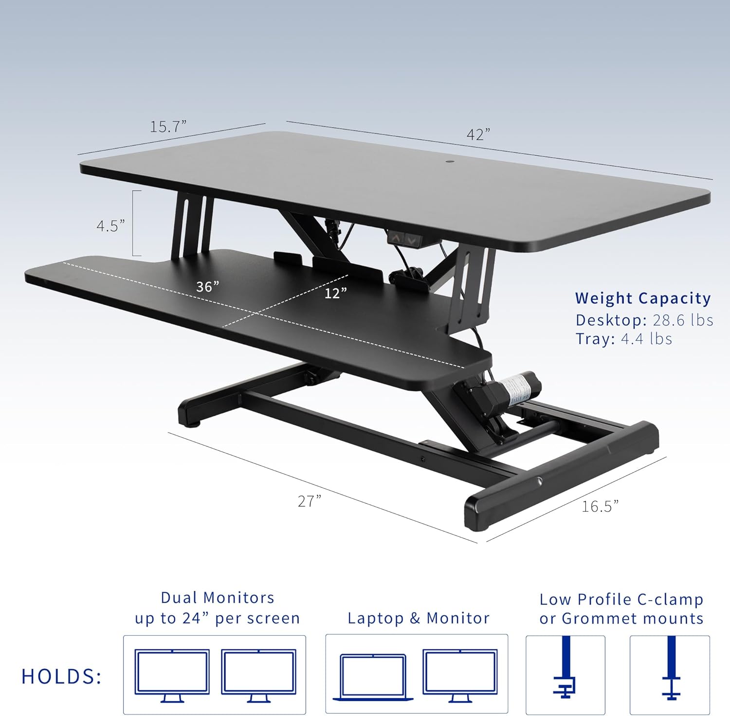 Create Instant Active Standing - VIVO’s 2-arm electric desk riser provides on-demand standing throughout the day for the freedom to get out of your chair and relieve muscle tension, reduce stress, and increase productivity. –Patented– Spacious 42” Surface - The top surface measures 42” x 15.7”, providing plenty of room for dual monitor and laptop setups. The 36” x 12” keyboard tray raises in sync with the top surface to create a comfortable workstation. Minimalist look blends well with most modern office decor. Strong 28.6 lbs Electric Lift - The powerful, quiet motor creates a smooth transition so you can easily find your ideal height setting with just the push of a button (Adjustment Range: 5.7" to 19.5"). Lift design elevates straight upwards and supports up to 28.6 lbs on the desktop. Very Minimal Assembly - This riser is almost ready to go right out of the box! Place on your existing desk, attach the keyboard tray, and start organizing your workstation. We’ve Got You Covered - Sturdy, high-grade steel design is backed with a 3-Year Manufacturer Warranty and friendly tech support to help with any questions or concerns.