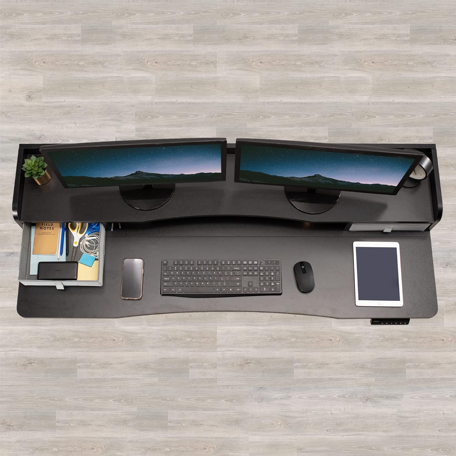 Create Instant Active Standing - Go from sitting to standing in one smooth motion with this complete active workstation providing comfortable viewing angles and customized user heights. Say goodbye to long hours of sitting, and end the day feeling energized and refreshed! 2 Tier Mobile Workstation - Customize your setup with an innovative 2-tier standing desk. Place your monitors on the top tier for ergonomic screen viewing and enjoy extra storage underneath. The main desktop measures 59.1" x 12.8", and the top tier is 59.1" x 11". Durable casters create smooth mobility on a variety of floor surfaces. Powerful Electric Motor - The main desktop uses a single motor lift system with a height range of 30.7" to 50". The simple push-button controller features 3 memory settings to save your desired heights. Strong 176 lbs Support - With an all-steel frame, this desk is able to support up to 176 lbs with excellent stability. The sturdy table tops create a modern appearance that blends with a variety of home and office environments. We’ve Got You Covered - This complete standing workstation is backed with a 3 Year Manufacturer Warranty and friendly tech support to help with any questions or concerns.
