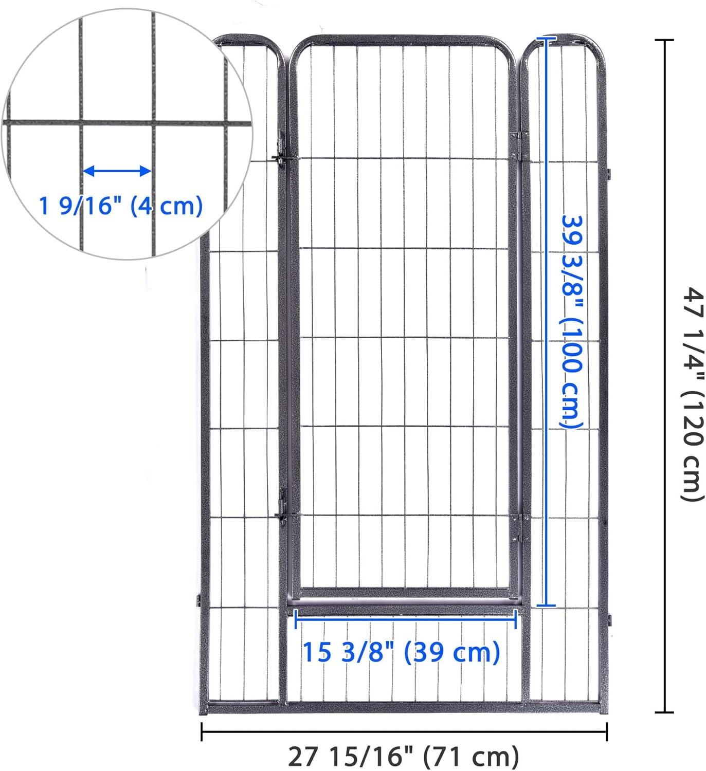 [Rust-resistant & Sturdy Fence]: 16 pieces 28”Wx47”H Pet Playpen Panel is made of powder coated metal for great rust resistance, and keeping panel sleek and beautiful; 0.6"x0.6" square tube guarantees rigidity to withstand the weight of pet, ground stakes for firmly fixating the panels on the ground in outdoor space [Freely DIY Shape]: 16 detachable panels for freely changing the shape of fence into rectangle, square or octangle, a flexible fence to changing shape or coverage size for different occasions; Moreover, DIY more shapes with more panels, feel free to ask if you need more panels [Easy to Setup & Store]: No tool needed for installing, easily inserting rods for panel connection, finish assembly within minutes; Detachable design makes it great for storage, fold it to save space, also convenient to take it out while camping or picnicking [Safety Assurance]: Features round corners for protecting your pet from impact, providing a safe area for your beloved pets to rest or do exercise; 2 Latches double security to avoid your smart dog unlocking the door and going out of the fence [Large Covered Area]: 16 pieces of large panel to create an ample and safe space (about 44 square feet) for pets to stay, without forcing them to huddle in a small and narrow cage at home or in the outdoor, Panel with 47" in height is perfect for large dog or multiple dogs