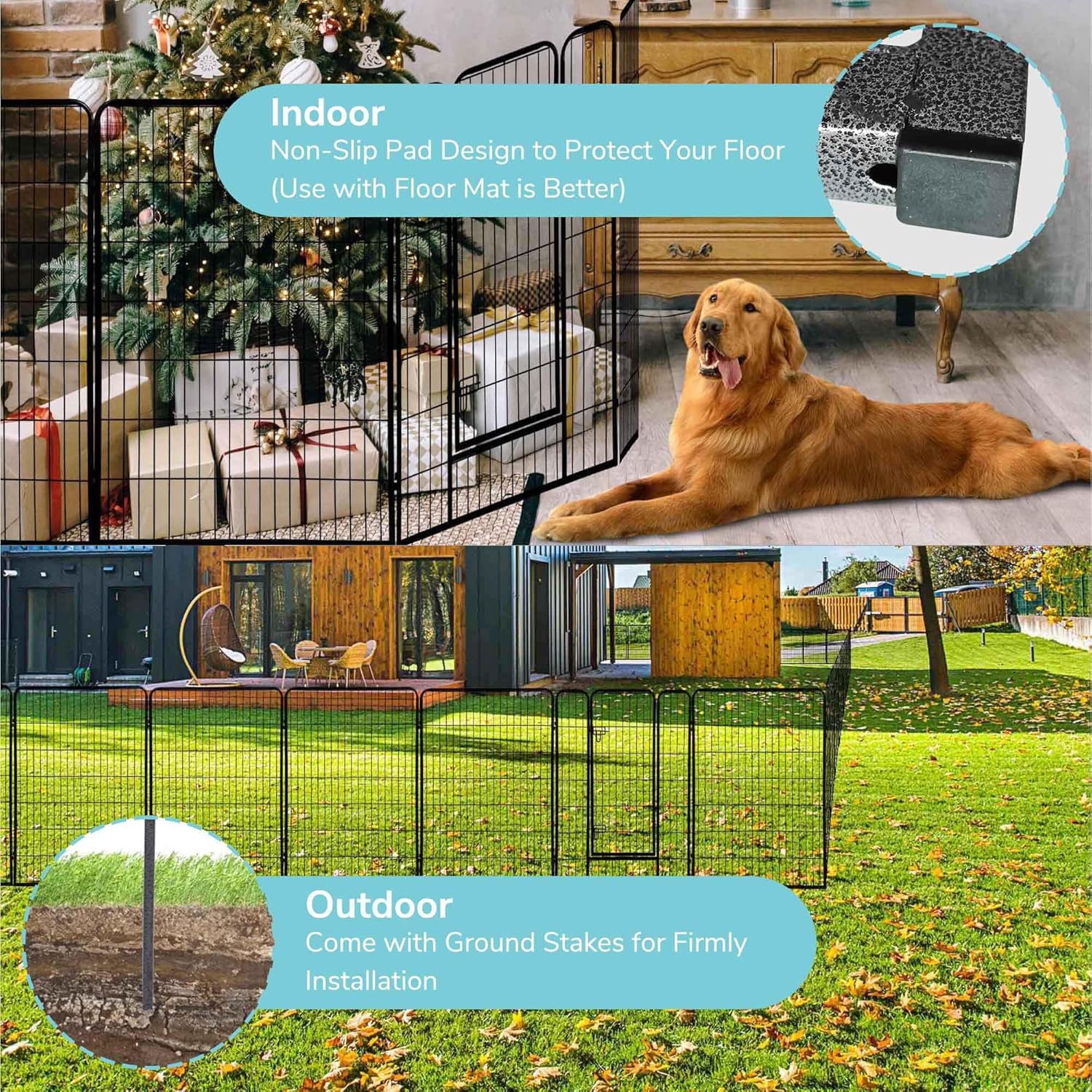 [Rust-resistant & Sturdy Fence]: 16 pieces 28”Wx47”H Pet Playpen Panel is made of powder coated metal for great rust resistance, and keeping panel sleek and beautiful; 0.6"x0.6" square tube guarantees rigidity to withstand the weight of pet, ground stakes for firmly fixating the panels on the ground in outdoor space [Freely DIY Shape]: 16 detachable panels for freely changing the shape of fence into rectangle, square or octangle, a flexible fence to changing shape or coverage size for different occasions; Moreover, DIY more shapes with more panels, feel free to ask if you need more panels [Easy to Setup & Store]: No tool needed for installing, easily inserting rods for panel connection, finish assembly within minutes; Detachable design makes it great for storage, fold it to save space, also convenient to take it out while camping or picnicking [Safety Assurance]: Features round corners for protecting your pet from impact, providing a safe area for your beloved pets to rest or do exercise; 2 Latches double security to avoid your smart dog unlocking the door and going out of the fence [Large Covered Area]: 16 pieces of large panel to create an ample and safe space (about 44 square feet) for pets to stay, without forcing them to huddle in a small and narrow cage at home or in the outdoor, Panel with 47" in height is perfect for large dog or multiple dogs