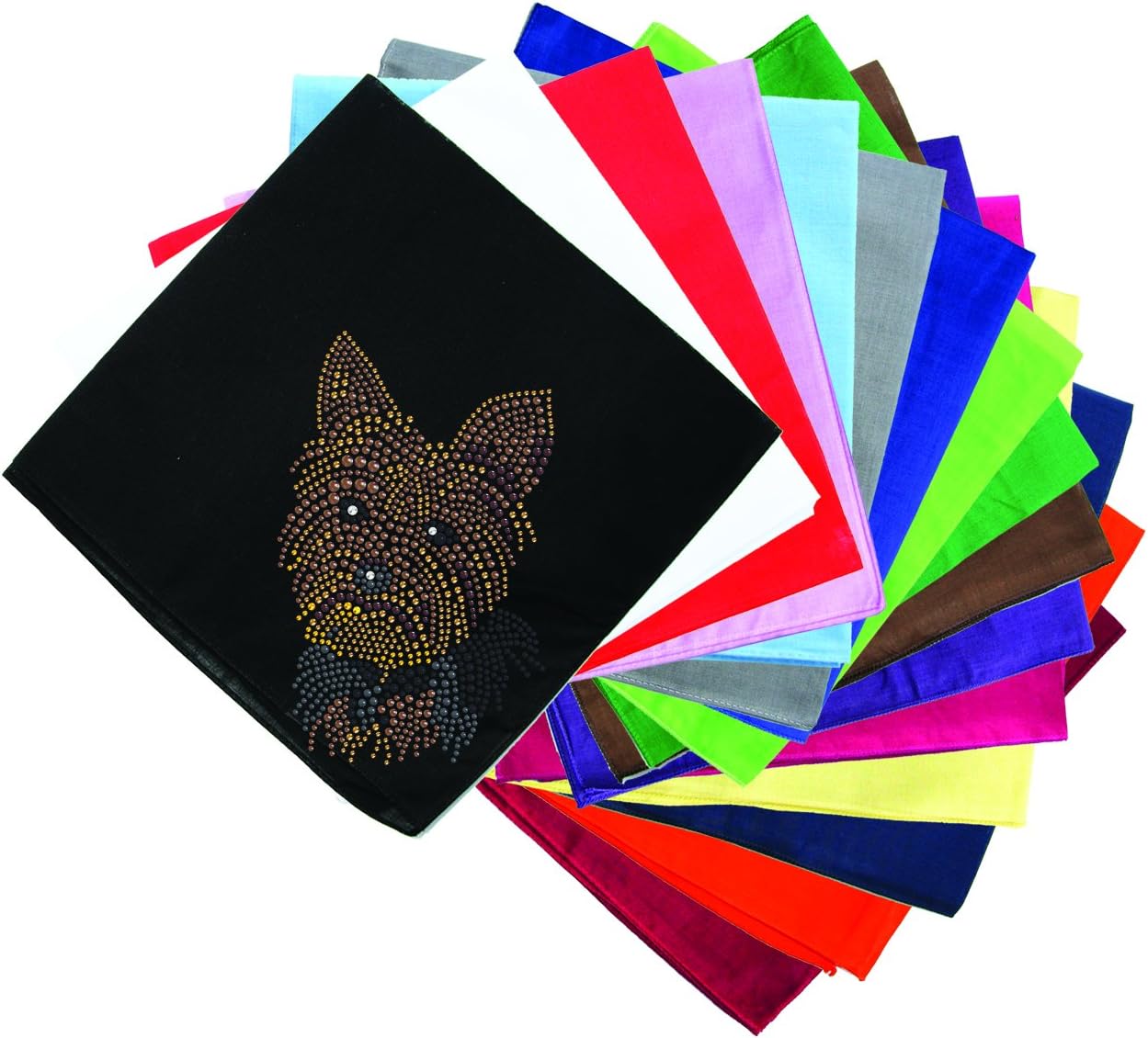 Dog in the Closet, Yorkie Face # 1 - Rhinestone Dog Bandana 22" X 22" cotton Bandana in choice of color 3.25" X 5" design with brown, copper, black & silver rhinestuds. Many rhinestone designs also available in smaller size bandana (14" X 14") for smaller dogs Rhinestone designs are also available for dog tees, dog tutus, and people tees.