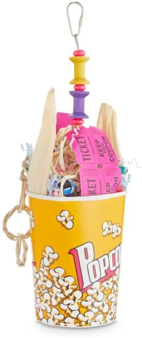 Premier Fun Popcorn Box Foraging Bird Toy from You & Me Helps relieve boredom for cockatiels, green cheek conures, sun conures, and similar-sized birds Brings entertainment to their habitat with a popcorn box showcasing bamboo finger traps, wood spools, paper shreds, and more Provides stimulation as birds instinctually pick and pull for food Includes a link connector for easy installment