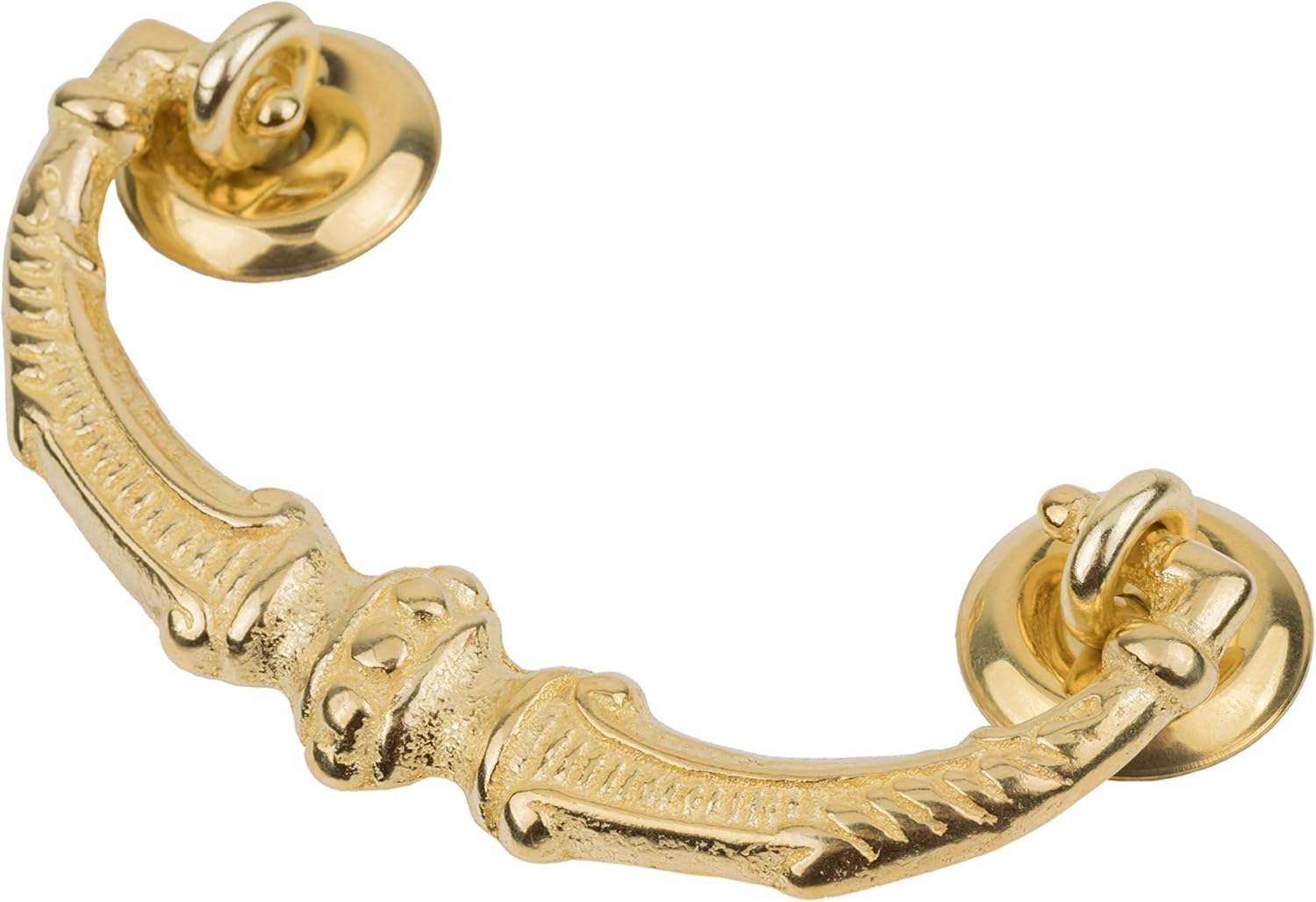 Dimensions: 3" Centers; 15/16" Rosette diameter. The bail is made of cast brass and rosettes are stamped brass. Its sturdy construction and traditional design make this hardware a good fit when you need a stylish and sturdy bail pull. The package contains one bail, two rosette backplates and two eye bolts with nuts. This classical era bail pull is easy to install and gives an antique look to your furniture piece. It perfectly complements an antique dresser, cabinet, armoire, bedside table, desk, chest, and more. Our handles are a nice feature for completing an antique restoration or woodworking project. Using these pulls on kitchen or bedroom furniture can also add a vintage touch to modern home decor.